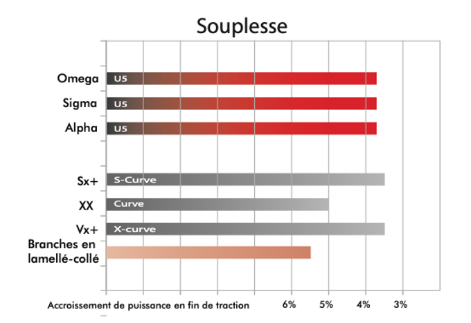 La souplesse des branches U5 est quasi équivalente à celle de notre précédente gamme S-Curve, avec une augmentation d’un peu plus de 3.5% de la puissance en fin de traction.